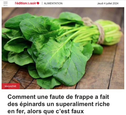 Réponse : VRAI, il y a bien du fer dans les épinards, et même davantage que dans la plupart des légumes verts, mais tout ce qu’on écrit sur cette histoire est totalement FAUX et quasiment tous les journalistes et les scientifiques se sont fait piéger et ont eux-mêmes relayé une rumeur. Pourquoi ? Parce que, tout simplement, ils n’ont pas vérifié l’information.